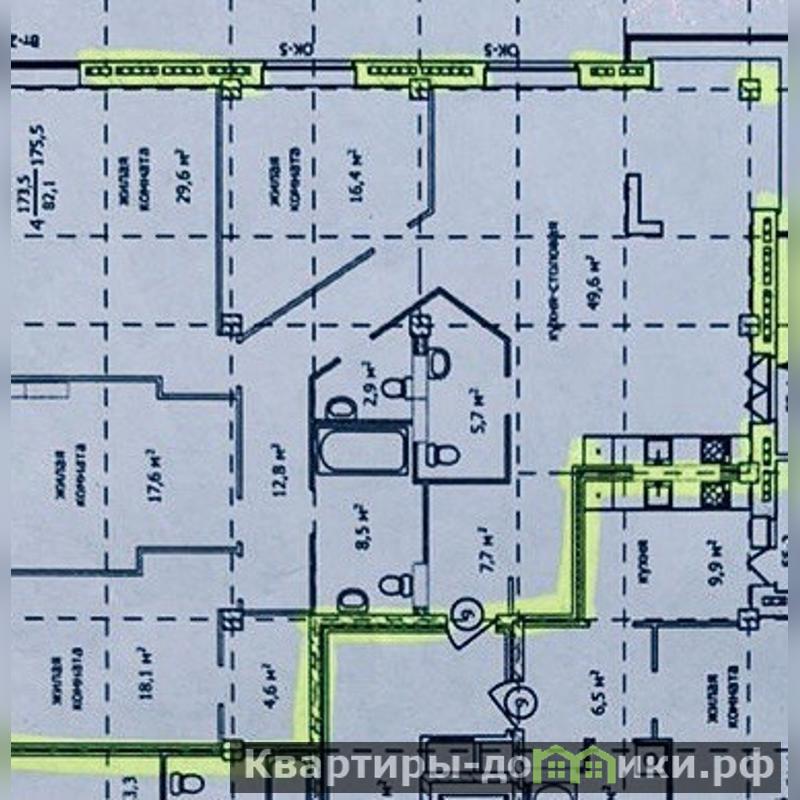 Просторная видовая квартира на 13-м этаже. Много света и пространства. Холл, большая кухня-гостиная 49.6 кв. м, четыре изолированные комнаты достойного метража: 16.4 кв.м, 29,6 кв.м, 17,6 кв.м и 18,1кв. м.