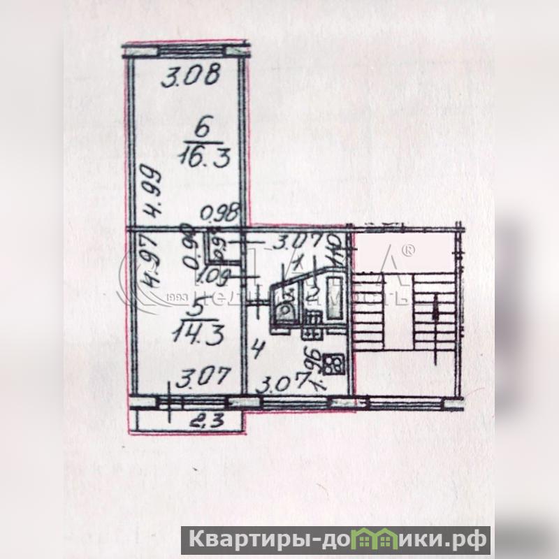 Площадь квартиры 44,9 кв.м, комнаты 16,3 + 14,3 кв.м, кухня 7 кв.м, санузел раздельный, балкон. Плита газовая, горячее водоснабжение центральное. Ремонт требуется.