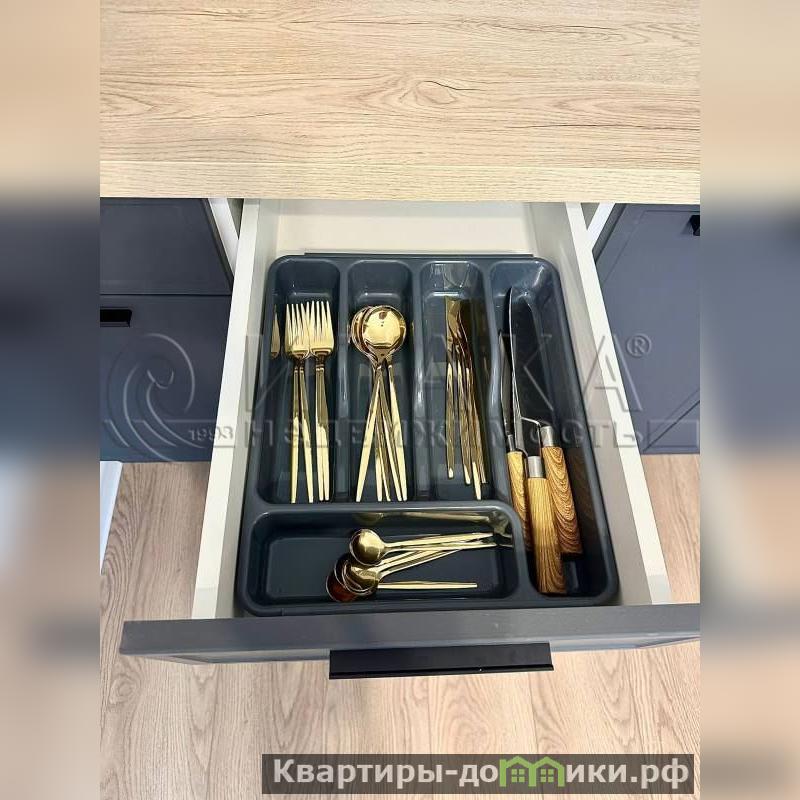 В кухне-гостиной установлен встроенный гарнитур. Из необходимого имеется: двухкамерный холодильник, чайник, микроволновка, посуда, столовые приборы.
