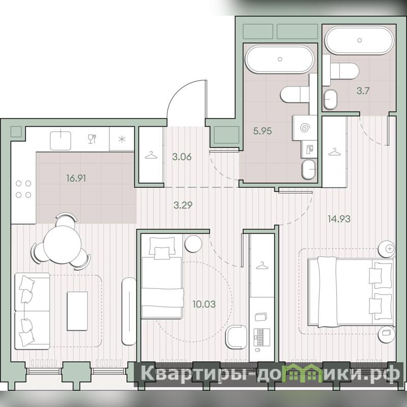 Жилая площадь 24.96 м2, кухня 16.91 м2, предчистовая отделка, комнаты изолированные.