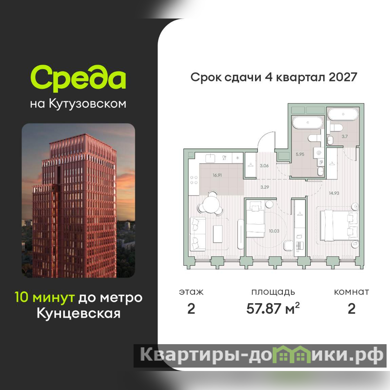 Продается 2-комн. квартира, площадью 57.87 м2 в монолитной новостройке в 12 мин. пешком от м. Кунцевская, район города - Кунцево. Возможен вариант покупки с использованием ипотечных средств, есть рассрочка.