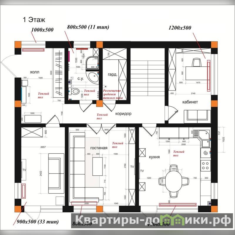 1 этаж: кухня, гостиная, 2 комнаты, санузел. Из кухни, гостиной и гостевой комнаты есть выход на большую открытую террасу. Из гаража есть вход в дом и в котельную.