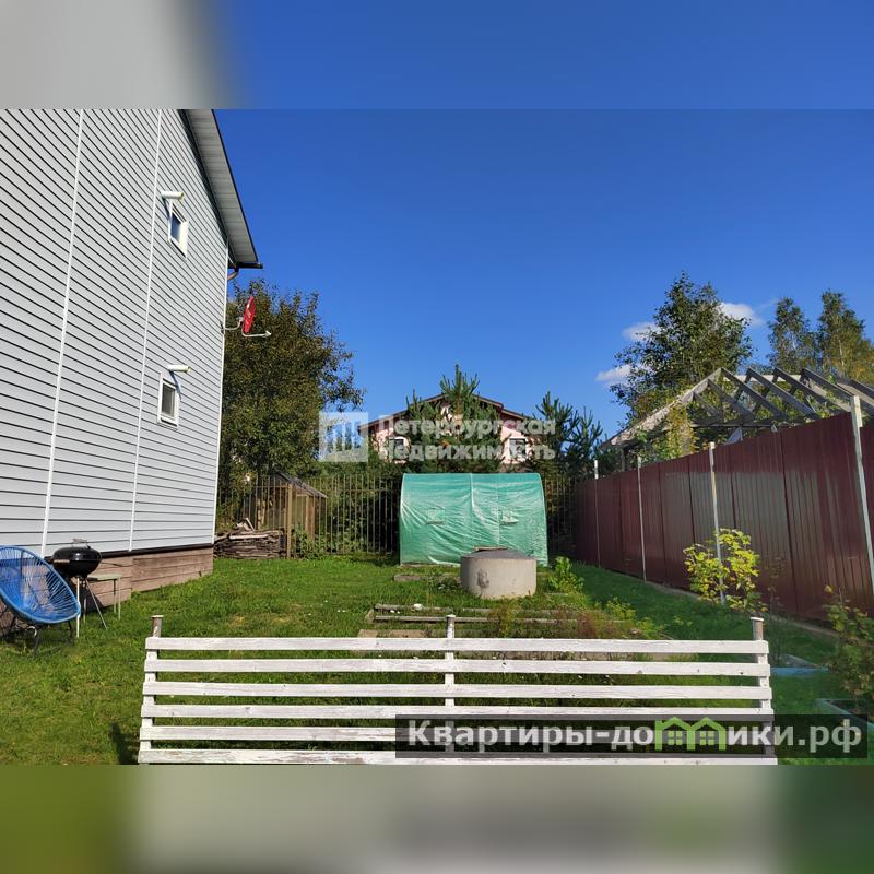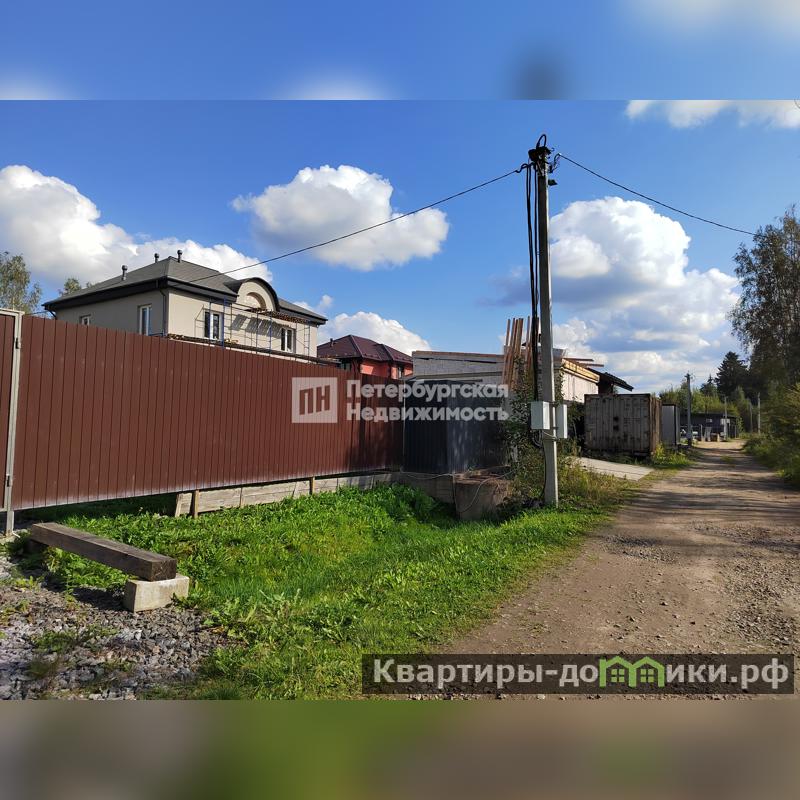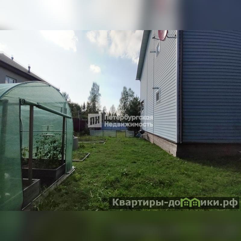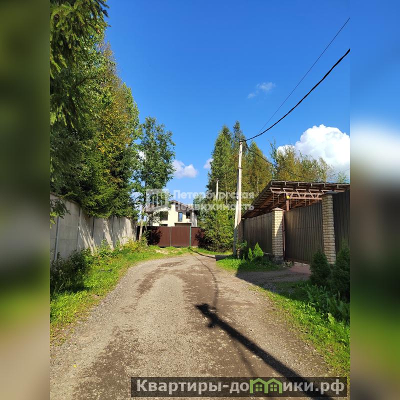 Участок сухой, ровный, правильной формы, выполнены дренажные работы, закрыт с 3-х сторон забором (метал.профлист), с торца дома 4-ая сторона забор метал.рейки, откатные ворота, сделаны: заезд и большая парковка отсыпана гравием, есть небольшой парник , клумбы, плодовые кустарники, сохранены хвойные растения (сосны).