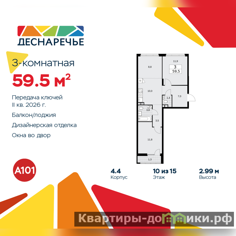Продается 3-комн. квартира с европланировкой и предчистовой отделкой в ЖК "Деснаречье" на 10 этаже. Общая площадь: 59.5 кв.м., жилая: 32.5 кв.м., общая площадь гостиной-столовой с кухонной зоной: 18.8 кв.м. Европланировка, кухня-гостиная - идеальный вариант для тех, кто любит часто принимать гостей. Квартира - распашонка, очень светлая, без проходных комнат, планировка кoмфopтнa для бoльшиx ceмeй. В квартире один балкон, один совмещенный и один раздельный санузел. Высота потолков 2.99 м.