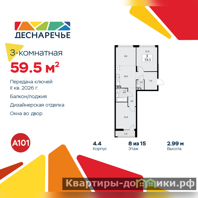 Просторная 3-комн. квартира с европланировкой и предчистовой отделкой в ЖК "Деснаречье" на 8 этаже. Общая площадь: 59.5 кв.м., жилая: 32.5 кв.м., общая площадь гостиной-столовой с кухонной зоной: 18.8 кв.м. Европейская планировка, кухня и гостиная объединены в одно просторное помещение. Квартира - распашонка, без проходных комнат, окна выходят на paзные стороны дома. В квартире один балкон, один совмещенный и один раздельный санузел. Высота потолков 2.99 м.