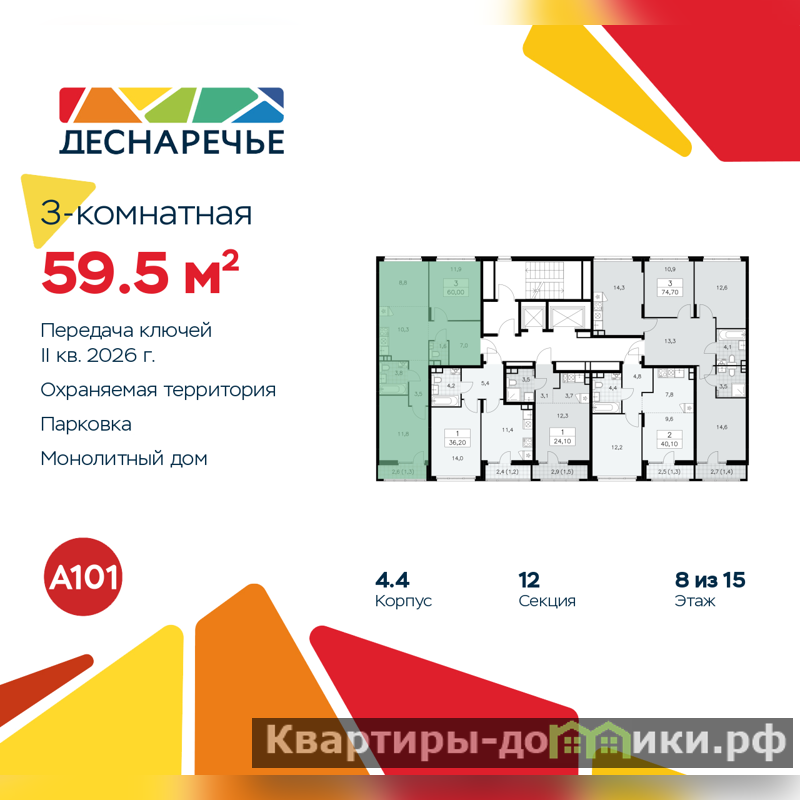 Дом монолитный, черырехподъездный, высотой 15 этажей. Квартира находится в 3-й секции в корпусе 4.4. На этаже 5 квартир. В подъезде 1 пассажирский и 1 грузовой лифт. Начало строительства - 3 квартал 2023 года. Окончание строительства - 2 квартал 2026 года. Оформление сделки по договору долевого участия.