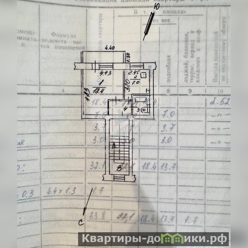 Общая площадь квартиры составляет 33.80 кв.м., из которых на кухню приходится 7 кв.м.