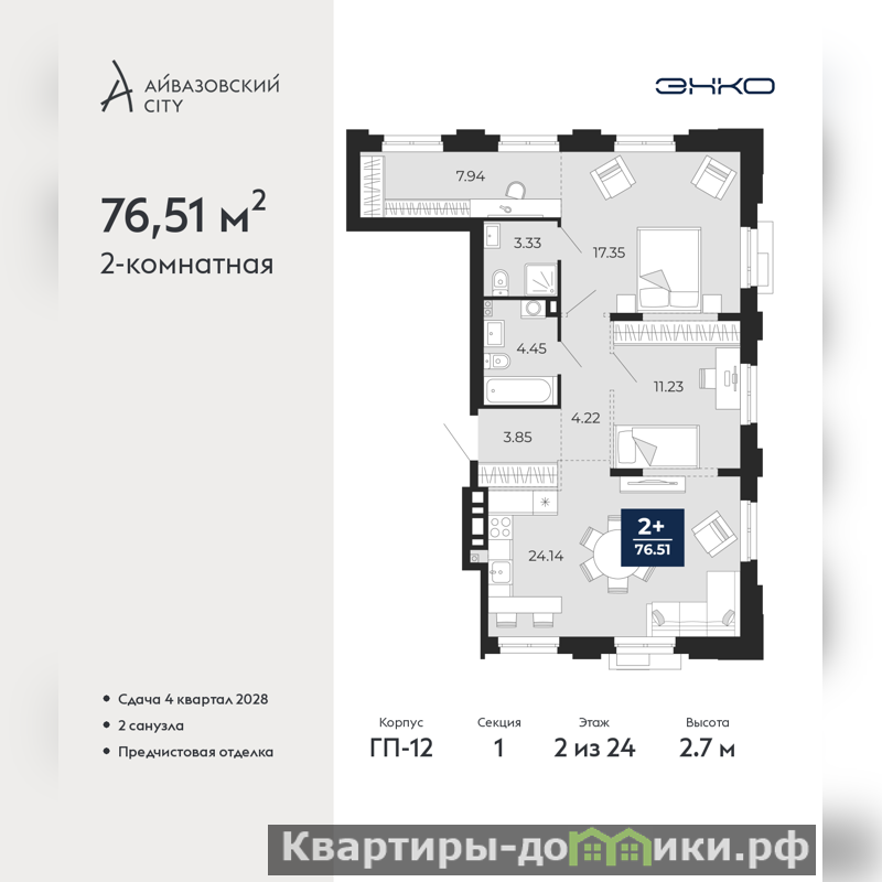 Просторная двухкомнатная квартира с предчистовой отделкой в ЖК "Айвазовский City" на 2 этаже. Общая площадь: 76.51 кв.м., жилая: 28.58 кв.м., площадь просторной кухни-столовой: 24.14 кв.м. Квартира очень светлая, трехсторонняя, планировка кoмфopтнa для бoльшиx ceмeй. В квартире два совмещенных санузла. Высота потолков 2.7 м.