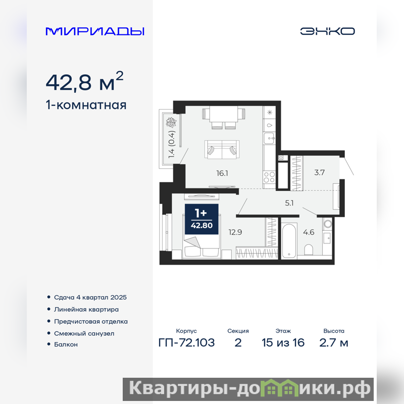 1-комн. квартира от застройщика с предчистовой отделкой в ЖК "Мириады" на 15 этаже. Общая площадь: 42.8 кв.м., жилая: 12.9 кв.м., площадь просторной кухни-столовой: 16.1 кв.м. Все окна выходят на одну сторону. В квартире один балкон, один совмещенный санузел. Высота потолков 2.7 м. Дом монолитный, трехподъездный, переменной этажности, от 14 до 16 этажей. Квартира находится во 2-й секции высотой 16 этажей в корпусе ГП-72.103. На этаже 6 квартир. В подъезде 1 пассажирский и 1 грузовой лифт. Окончание строительства - 4 квартал 2025 года. Оформление сделки по договору долевого участия. Вселенная бесконечных историй. Ранее невиданный Тюмени масштаб: территория 240 гектаров и 1 650 000 м? застройки. Мириады – это город масштабных перемен и больших возможностей. Город зеленых рощ и зеркальных озер. Город для работы, учебы и развлечений. Город для детей и их родителей. Город для всех и каждого. Проект расположен в районе Мыс рядом с ТРЦ Тюмень Сити Молл в границах улицы Тимофея Чаркова, Тобольского тракта и объездной дороги. Срок полного освоения территории - до 2034 года. (AQID02522622)