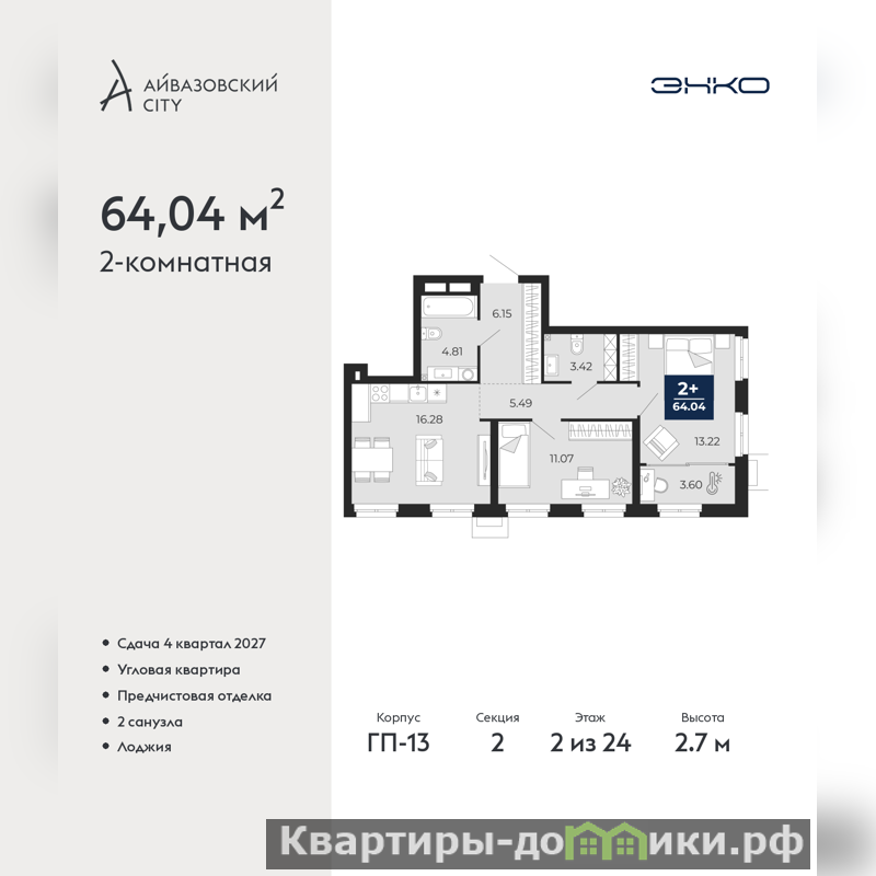 2-комн. квартира от застройщика с предчистовой отделкой в ЖК "Айвазовский City" на 2 этаже. Общая площадь: 64.04 кв.м., жилая: 24.29 кв.м., площадь просторной кухни-столовой: 16.28 кв.м. Угловая квартира, идеально подойдет любителям тишины и панорамных видов. В квартире одна лоджия, один совмещенный и один раздельный санузел. Высота потолков 2.7 м.