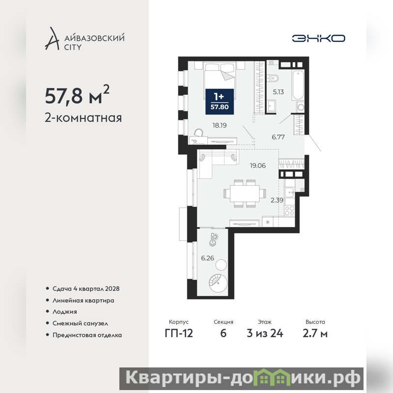 Продается 2-комн. квартира с европланировкой и предчистовой отделкой в ЖК "Айвазовский City" на 3 этаже. Общая площадь: 57.8 кв.м., жилая: 37.25 кв.м., суммарная площадь гостиной-столовой с кухонной зоной: 21.45 кв.м. Европланировка, кухня-гостиная - идеальный вариант для тех, кто любит часто принимать гостей. Комнаты изолированные, все окна выходят на одну сторону. В квартире одна лоджия, один совмещенный санузел. Высота потолков 2.7 м.
