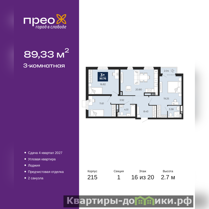 Трехкомнатная квартира с предчистовой отделкой в ЖК "Прео" на 16 этаже. Общая площадь: 89.33 кв.м., жилая: 47.68 кв.м., площадь просторной кухни-столовой: 20.8 кв.м. Квартира угловая, очень светлая, естественная вентиляция при открытии окон. В квартире одна лоджия, два совмещенных санузла. Высота потолков 2.7 м.