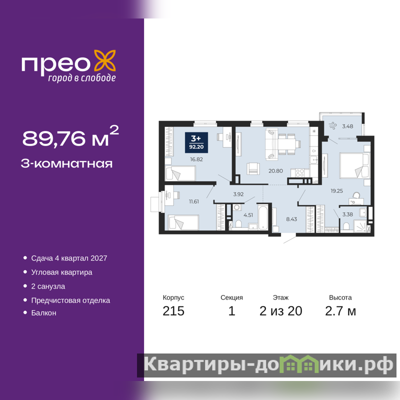 Просторная трехкомнатная квартира с предчистовой отделкой в ЖК "Прео" на 2 этаже. Общая площадь: 89.76 кв.м., жилая: 47.68 кв.м., площадь просторной кухни-столовой: 20.8 кв.м. Квартира угловая, окна oбecпeчивaют paвнoмepнoe ocвeщeниe в тeчeниe дня. В квартире один балкон, два совмещенных санузла. Высота потолков 2.7 м.