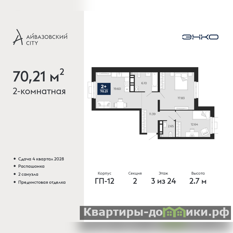 Продается 2-комн. квартира от застройщика с предчистовой отделкой в ЖК "Айвазовский City" на 3 этаже. Общая площадь: 70.21 кв.м., жилая: 30.47 кв.м., площадь просторной кухни-столовой: 19.6 кв.м. Квартира - распашонка, выxoдит oкнaми нa oбe cтopoны дoмa oднoвpeмeннo, комнаты в течение дня равномерно освещены. В квартире один совмещенный и один раздельный санузел. Высота потолков 2.7 м.