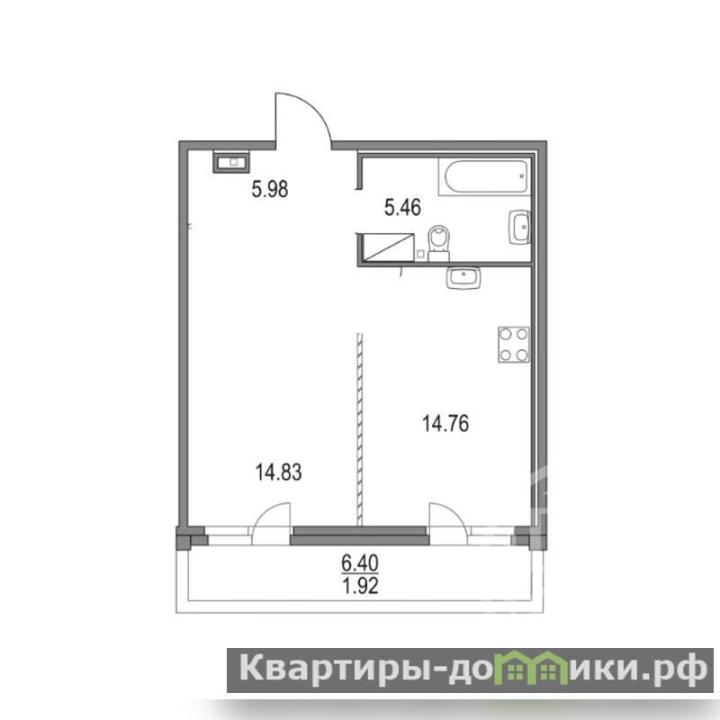 Кухня -9,6 м2, комната: свободная планировка -15м2.