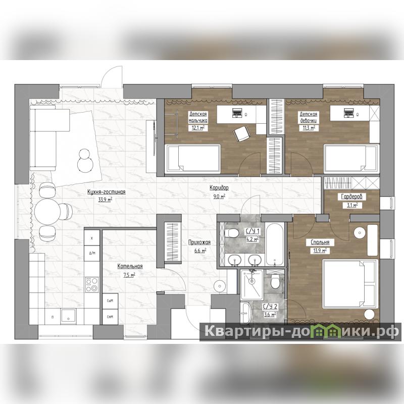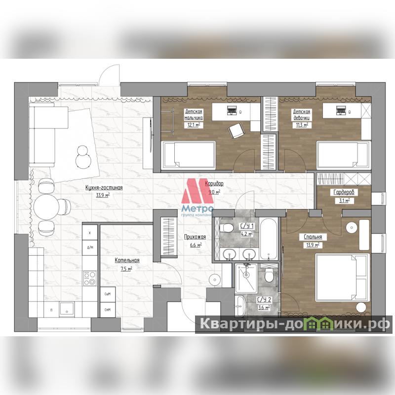 - 4 комнаты (вкл. кухню-гостиную 34м2 и мастер спальню со своим сан. узлом и гардеробной);