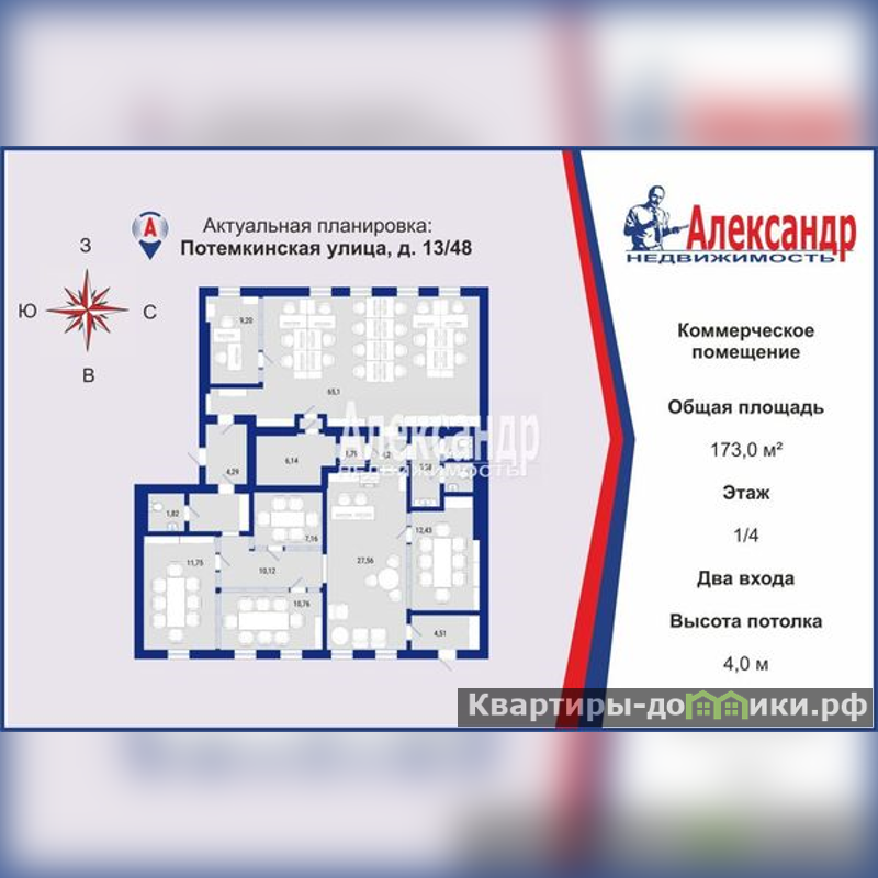 1704932 Предлагаем в аренду представительский офис компании или как помещение свободного назначения с качественным дизайнерским ремонтом площадью 173кв. м в историческом квартaлe Центрального района Санкт-Петербурга на Потемкинской ул. д. 13. <br/><br/>? Kлючевые пpeимущеcтвa:<br/>• Локация . Напротив – в 20 метрах - Таврический сад, Таврический дворец, Ленинград-Центр, Оранжерея, рядом исторические дворцы и посольства разных стран. В 5 минутах -Парадный квартал, Невская Ратуша и комплекс зданий Правительств Санкт-Петербурга и Ленинградской области. <br/>• Ликвидность: Отдeльный вход с Потемкинской ул., свежий дизайнерский ремонт, продуманная планировка и свободное назначение делают помещение привлекательным для широкого круга арендаторов на долгие годы развития бизнеса.<br/>• Гибкие условия: Мы предлагаем гибкие варианты аренды чтобы удовлетворить ваши цели.<br/>Потенциал для собственного проекта: Есть возможность организовать помещение под себя для размещения представительского офиса, шоу-рума, коворкинга или творческого пространства.<br/>? Детали объекта :<br/>· Помещение: 173 кв. м, 1 этаж, первая линия ул. Потемкинская удобная планировка с возможностью трансформации , два отдельных входа, готовый свежий авторский дизайнерский ремонт, отделка с использованием качественных материалов и технологий. Объект оснащен мебелью, всеми необходимыми новыми системами жизнеобеспечения и безопасности, смонтированы системы видео-наблюдения с контроллерами и регистраторами, сетевое оборудование с оптическим вводом и малоточными сетями (свичами, контроллерами и конвекторами). Все новое без амортизации.<br/>- Технические характеристики: высота потолков 4 м, 6 витринных окон, электричество 15 кВт.<br/><br/>· Транспорт: 5 минут пешком – станция Метро Чернышевская. Вся транспортная инфраструктура центра города. Все знаковые исторические достопримечательности города в 10 минутной доступности на автомобиле.<br/><br/>Свяжитесь с нами, чтобы назначить просмотр и оценить все ...