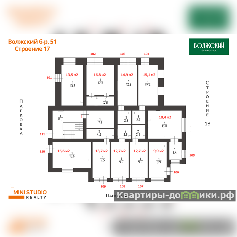 3 отдельных входа: 16,8+14,9+15,1 кв.м на 1 этаже в Бизнес-парке Волжский.