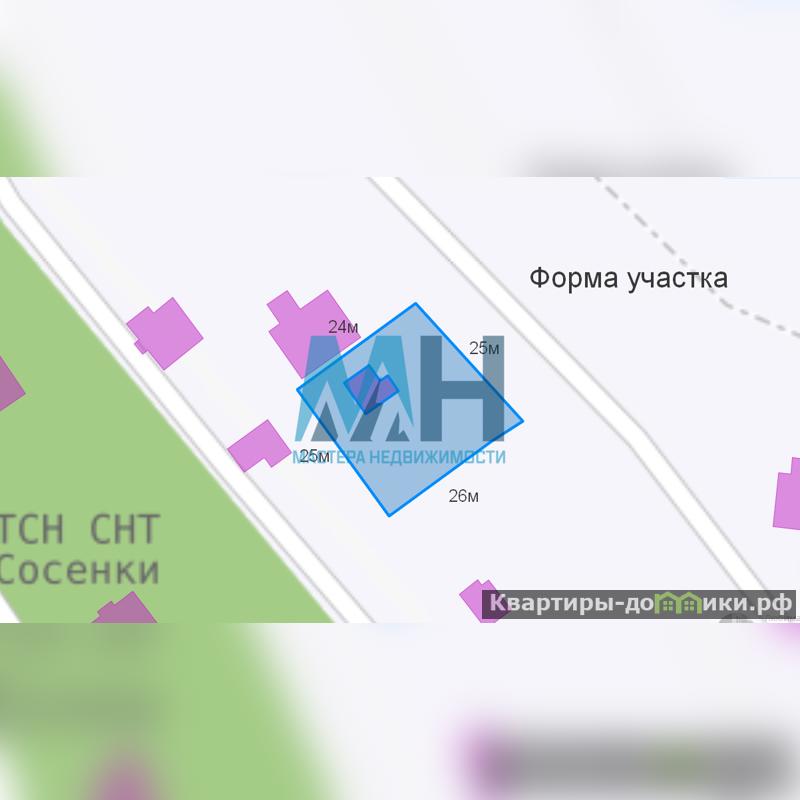 Размер участка 25 на 24 метра, практически правильная квадратная форма.