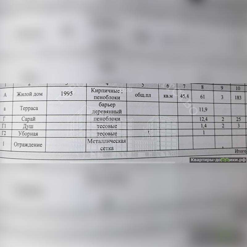 Площадь дома 45,4 кв.м. + терраса 11,4 кв.м. Год постройки - 1995. Стены - оштукатуренные и покрашенные пеноблоки (кирпич). Фундамент - ленточный, полы деревянные, крыша - шифер. Окна - деревянные. Один собственник.