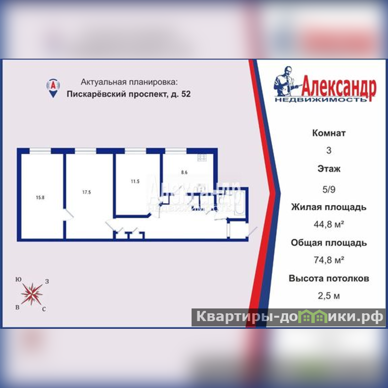 1704971 Продается большая 74,8 кв.м, теплая квартира для большой семьи в Калининском районе Санкт-Петербурга.<br/>Квартира расположена на 5 этаже 9-этажного кирпичного дома, 1978 года постройки.<br/>Жилая площадь 44,8 кв.м. - комнаты 11,5 кв.м + (17,5 кв.м + 15,8 кв.м); кухня 8,6 кв.м; коридор 13,1 кв.м; ванная 2,9 кв.м; туалет 0,9 кв.м. <br/>Во всех помещениях, кроме комнаты 15,8 кв.м выполнен качественный ремонт, на полу ламинат, натяжные потолки со встроенными светильниками. <br/>Покупателю останется кухонный гарнитур и мебель частично.<br/>Чистый подъезд, хорошие соседи. Наземная парковка во дворе, свободные места есть всегда.<br/>Ближайшие станции метро - Академическая и Площадь Мужества. В пешей доступности ж/д станция Пискаревка. Удобный выезд на КАД.<br/>Во дворе дома расположен детский сад, в непосредственной близости школа, Санкт-Петербургский технический колледж. Рядом магазины, аптеки, пункты выдачи.<br/>Район очень зеленый, Пискаревский лесопарк для прогулок, Дворец спортивных игр Зенит<br/>Два взрослых собственника, без обременений и перепланировок, полная сумма в договоре, подходит под ипотеку всех банков (при необходимости, поможем вам с одобрением).<br/>Звоните, отвечу на все интересующие вопросы, оперативно организую показ квартиры.<br/>