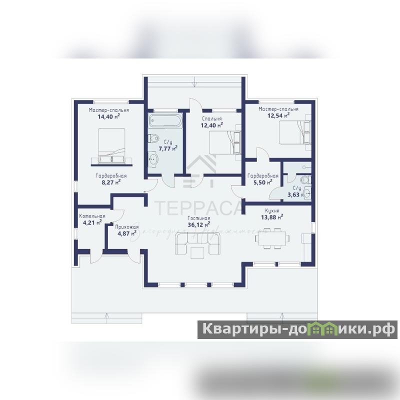 1 этаж – кухня-гостиная, 3 изолированные комнаты (две – мастер-спальни с гардеробными), прихожая, котельная, 2 с/у.<br />