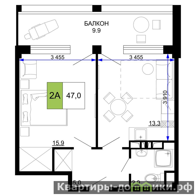 Жилая площадь 15.9 м2, кухня 13.3 м2, чистовая отделка с мебелью.