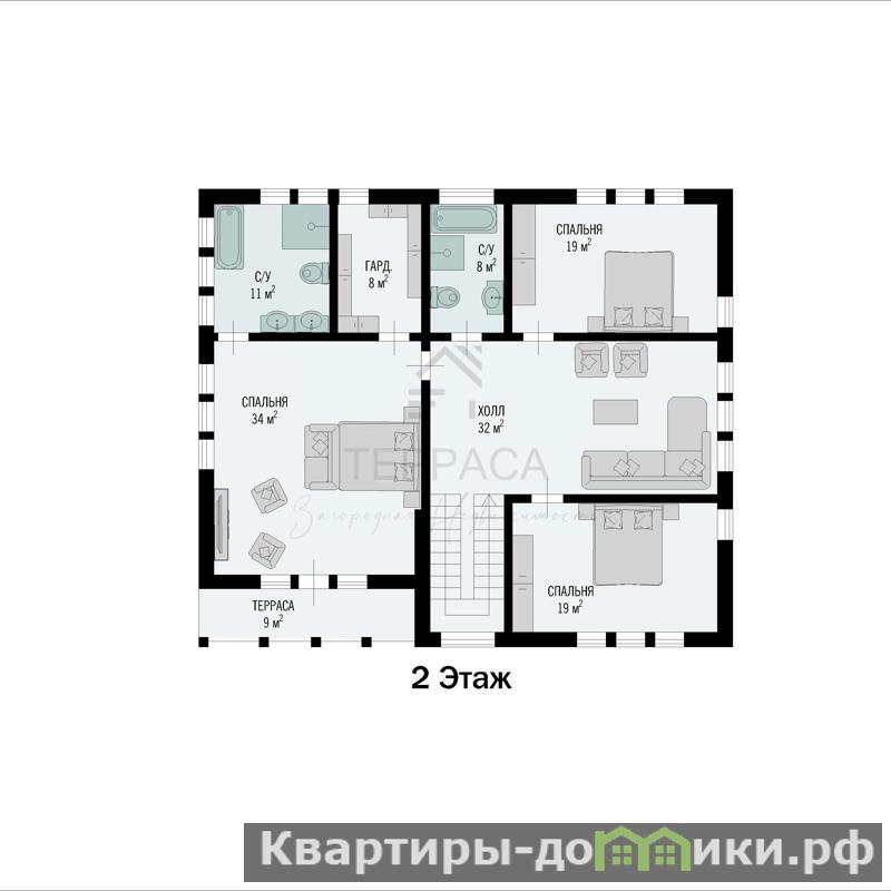 2 этаж – 3 изолированные комнаты (одна из них – с выходом на террасу, отдельной гардеробной и с/у), просторный холл с ТВ-зоной, с/у.<br />