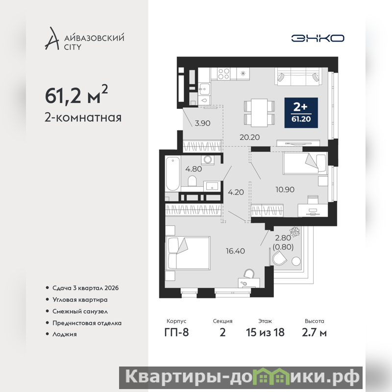 Продается 2-комн. квартира с предчистовой отделкой в ЖК "Айвазовский City" на 15 этаже. Общая площадь: 61.2 кв.м., жилая: 27.3 кв.м., площадь просторной кухни-столовой: 20.2 кв.м. Угловая квартира, окна oбecпeчивaют paвнoмepнoe ocвeщeниe в тeчeниe дня. В квартире одна лоджия, один совмещенный санузел. Высота потолков 2.7 м.