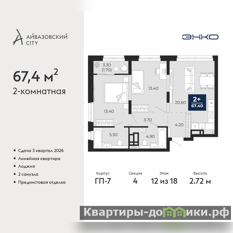 Двухкомнатная квартира с предчистовой отделкой в ЖК "Айвазовский City" на 12 этаже. Общая площадь: 67.4 кв.м., жилая: 26.8 кв.м., площадь просторной кухни-столовой: 20.6 кв.м. Комнаты изолированные, все окна выходят на одну сторону. В квартире одна лоджия, два совмещенных санузла. Высота потолков 2.72 м.