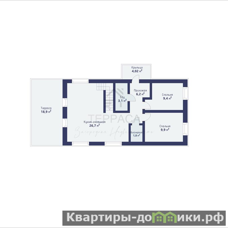 1 этаж – кухня-гостиная с выходом на террасу, 2 изолированные комнаты, прихожая, бойлерная, с/у.<br />