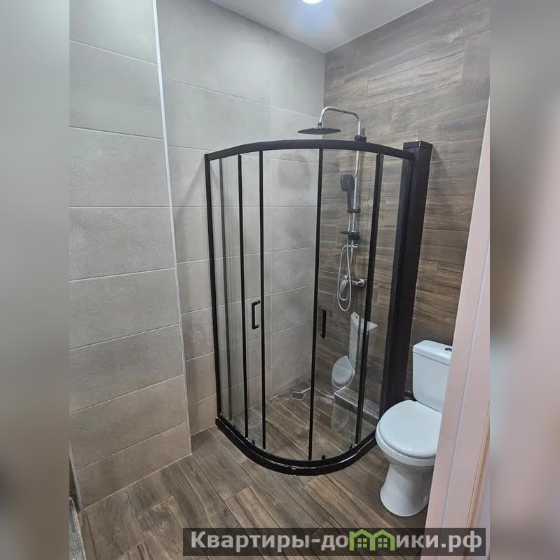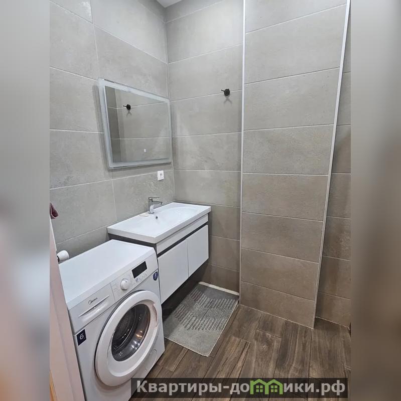 Санузел оборудован стиральной машиной, навесной раковиной, зеркалом и душем. Напольная плитка в санузле имитирует паркет, гармонично дополняя общий дизайн квартиры. Особенно эта квартира будет удобна для студентов: наличие встроенной стиральной машины позволяет сэкономить место и не тратить время и деньги на поиск прачечной.