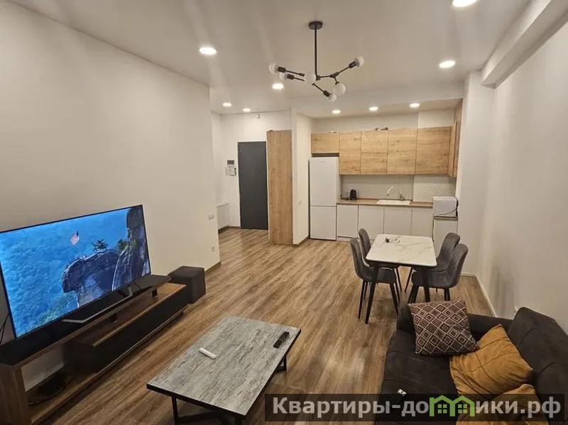 В гостиной — удобный диван с подушками, компактный журнальный столик, тумба под телевизор и кондиционер, который поддерживает комфортную температуру в помещении в любое время года.