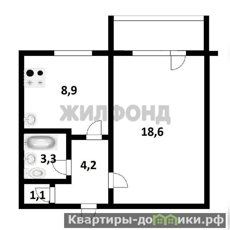 В квартире имеется одна просторная комната, которая может быть использована как спальня или гостиная. Кухня также имеет достаточно пространства для размещения обеденной зоны и кухонного гарнитура. Санузел совмещенный.