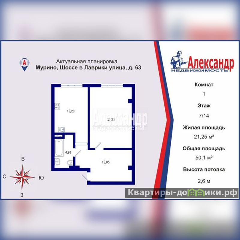 1705018 Продается просторная, уютная и светлая 1-комнатная квартира 50,1 кв.м. (по факту 52 кв. м.) 7/14 этаж. <br/>В квартире выполнен современный ремонт с использованием качественных строительных, отделочных материалов и сантехники. Вся мебель и техника остается новым владельцам. <br/><br/>Планировка: комната (21,25 кв. м) просторная и удобно зонирована (рабочее пространство можно отделить); коридор 13,85 кв.м. (с выделенной зоной под гардеробную -можно сделать закрытой (закладные готовы); просторная современная ванная комната (4,3 кв. м.) - теплый пол, установлены датчики протечек во всех мокрых точках, гигиенический душ; большая кухня (13,2 кв. м) со всей необходимой техникой, установлен питьевой фильтр для воды.<br/><br/>Инфраструктура и удобства:<br/>Дом находится в зеленом районе. Рядом есть все для комфортной жизни: магазины, аптеки, пекарни, ПВЗ, медицинские центры, в пешей доступности новая поликлиника, фитнес-центры, ТРК "Небо", парк Лаврики, прогулочные зоны и др. <br/>Двор закрыт шлагбаумом. Есть детская и спортивная площадки. Детские сады и школа в 5 минутах пешком от дома.<br/><br/>Транспортная доступность:<br/>До ст. м. "Девяткино" пешком 20 минут, на общественном транспорте 7-10 минут (автобусная остановка находится в 3-х минутах пешком от дома). Ж/д станция Лаврики в 15 минутах пешком, откуда можно уехать как до красивейших озер Кавголовское и Хепоярви (15 минут), так и до Финляндского вокзала (30 минут).<br/><br/>Юридическая информация:<br/>Прямая продажа, 1 собственник (будет лично присутствовать на сделке), обременение - ипотека (гасим сами перед сделкой), никто не прописан, материнский капитал не использовался. В договоре будет указана полная стоимость. <br/><br/>Эта квартира — отличный вариант для тех, кто ищет готовое жилье с качественным ремонтом и мебелью. Можно сразу заехать и жить! <br/>Просмотры в любое время по предварительной договоренности.<br/>Звоните, отвечу на все вопросы.<br/>