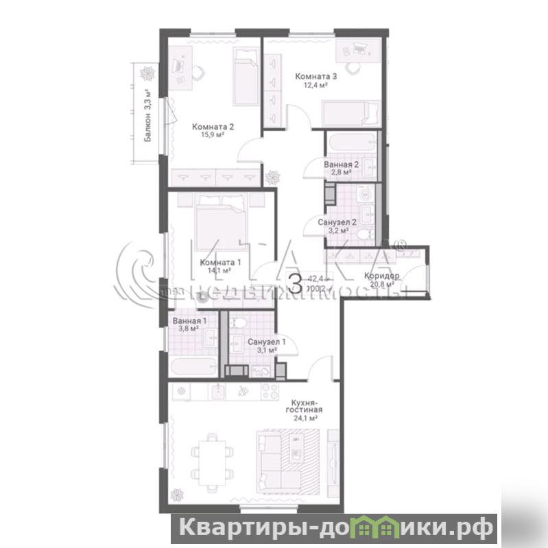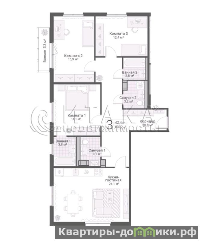 Изолированные комнаты и большая кухня - идеальна для жизни семьи с детьми. Два раздельных санузла. Чистовая отделка от застройщика - вам останется только воплотить свои дизайнерские идеи и расставить мебель по вкусу.