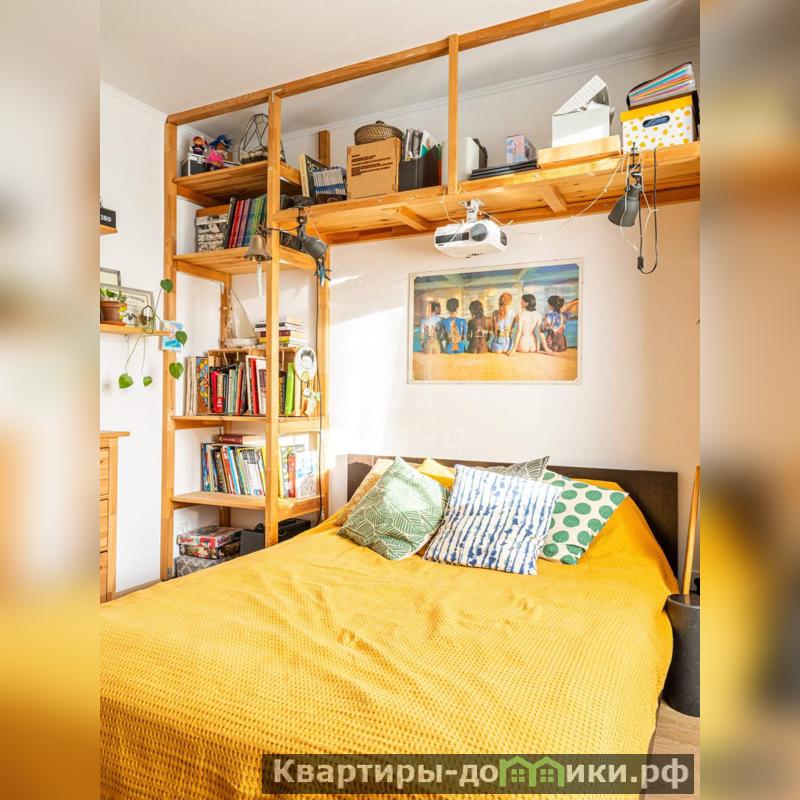 - В спальной комнате лаконично установлена система хранения, а также проектор для уютных киновечеров.