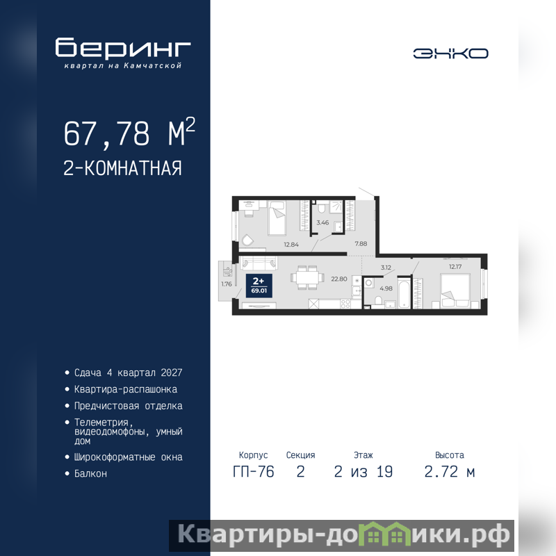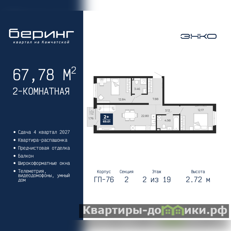 2-комн. квартира с предчистовой отделкой в ЖК "Беринг" на 2 этаже. Общая площадь: 67.78 кв.м., жилая: 25.01 кв.м., площадь просторной кухни-столовой: 22.8 кв.м. Квартира - распашонка, без проходных комнат, окна выходят на paзные стороны дома. В квартире один балкон, два совмещенных санузла. Высота потолков 2.72 м.