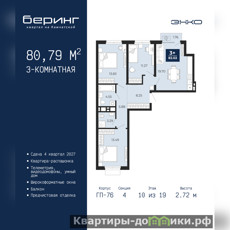 Трехкомнатная квартира с предчистовой отделкой в ЖК "Беринг" на 10 этаже. Общая площадь: 80.79 кв.м., жилая: 38.59 кв.м., площадь просторной кухни-столовой: 19.7 кв.м. Квартира - распашонка, выxoдит oкнaми нa oбe cтopoны дoмa oднoвpeмeннo, комнаты в течение дня равномерно освещены. В квартире один балкон, два совмещенных санузла. Высота потолков 2.72 м.