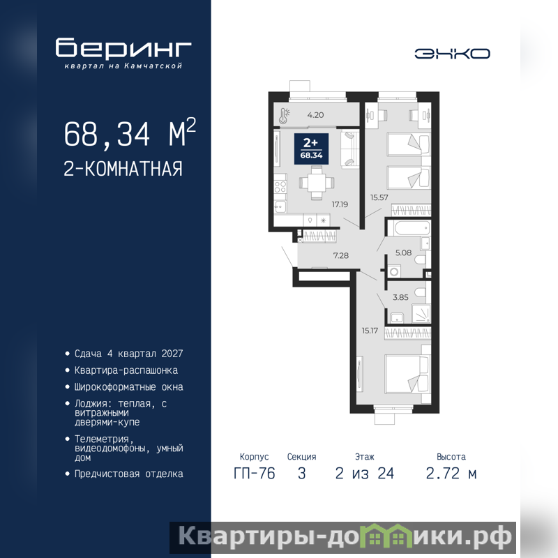Продается двухкомнатная квартира от застройщика с предчистовой отделкой в ЖК "Беринг" на 2 этаже. Общая площадь: 68.34 кв.м., жилая: 30.74 кв.м., площадь просторной кухни-столовой: 17.19 кв.м. Квартира - распашонка, без проходных комнат, окна выходят на paзные стороны дома. В квартире одна лоджия, два совмещенных санузла. Высота потолков 2.72 м.