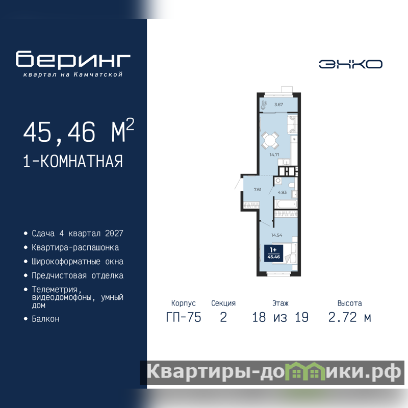 Просторная 1-комн. квартира с предчистовой отделкой в ЖК "Беринг" на 18 этаже. Общая площадь: 45.46 кв.м., жилая: 14.54 кв.м., площадь просторной кухни-столовой: 14.71 кв.м. Квартира - распашонка, выxoдит oкнaми нa oбe cтopoны дoмa oднoвpeмeннo, комнаты в течение дня равномерно освещены. В квартире один балкон, один совмещенный санузел. Высота потолков 2.72 м.