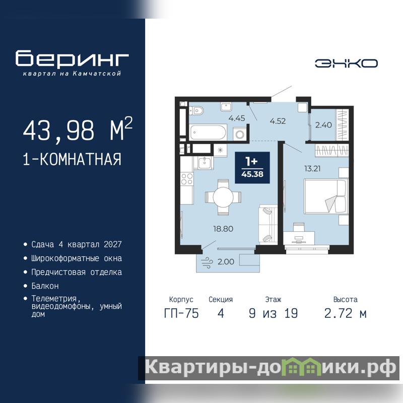 Просторная 1-комн. квартира с предчистовой отделкой в ЖК "Беринг" на 9 этаже. Общая площадь: 43.98 кв.м., жилая: 13.21 кв.м., площадь просторной кухни-столовой: 18.8 кв.м. Все окна выходят на одну сторону. В квартире один балкон, один совмещенный санузел. Высота потолков 2.72 м. Дом монолитный, многоподъездный, переменной этажности, от 17 до 24 этажей. Квартира находится в 4-й секции высотой 19 этажей в корпусе ГП-75. На этаже 4 квартиры. В подъезде 2 пассажирских и 1 грузовой лифт. Окончание строительства - 4 квартал 2027 года. Оформление сделки по договору долевого участия. Подобно знаменитому исследователю, мы чувствуем себя первооткрывателями этой локации. Хотим показать новую суть места, сформировать для вас жизненный опыт, которого ещё не было. Беринг — район зелёного цвета. Беринг — район, который откроется вам с другой стороны. Впечатлит новым уровнем комфорта и качеством жизни. Беринг — открытие на карте города. Первый квартал расположен в районе Тура, в границах улиц: Камчатская – Западносибирская – Энтузиастов. Вокруг уже есть всё для того, чтобы ежедневная рутина была лишь частью жизни и не доставляла дискомфорта. Школы и детские сады, магазины и аптеки, поликлиника, места для семейного отдыха, пеших и велопрогулок, и даже рыбалки. Масштабное озеленение дворов — визитная карточка ЭНКО и ваш оазис спокойствия, чтобы отвлечься от повседневности. Раскидистые деревья, кустарники, травы и цветы — осталось остановиться, вдохнуть и расслабиться, глядя на эту природную красоту. Стилистика подъездов продолжает концепцию Беринга, вдохновлённого Камчаткой: сдержанный, но при этом впечатляющий дизайн соседствует с удобством и функциональностью. (AQID02529634)
