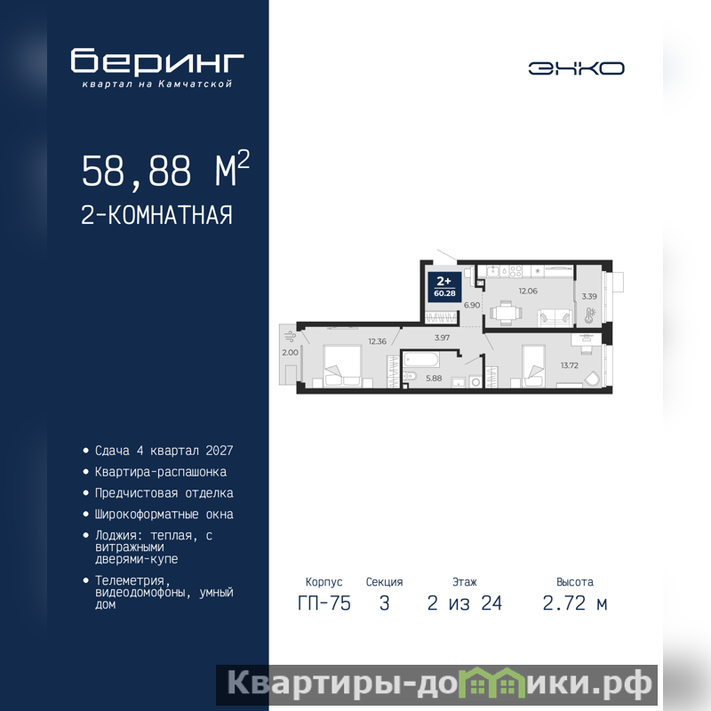 2-комн. квартира от застройщика с предчистовой отделкой в ЖК "Беринг" на 2 этаже. Общая площадь: 58.88 кв.м., жилая: 26.08 кв.м., площадь просторной кухни-столовой: 12.06 кв.м. Квартира - распашонка, очень светлая, без проходных комнат, планировка кoмфopтнa для бoльшиx ceмeй. В квартире один балкон и одна лоджия, один совмещенный санузел. Высота потолков 2.72 м.