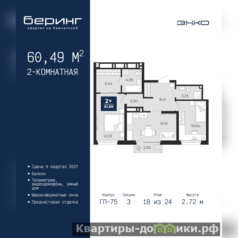 2-комн. квартира от застройщика с предчистовой отделкой в ЖК "Беринг" на 18 этаже. Общая площадь: 60.49 кв.м., жилая: 23.23 кв.м., площадь просторной кухни-столовой: 13.19 кв.м. Комнаты изолированные, все окна выходят на одну сторону. В квартире один балкон, два совмещенных санузла. Высота потолков 2.72 м. Дом монолитный, многоподъездный, переменной этажности, от 17 до 24 этажей. Квартира находится в 3-й секции высотой 24 этажа в корпусе ГП-75. На этаже 6 квартир. В подъезде 2 пассажирских и 1 грузовой лифт. Окончание строительства - 4 квартал 2027 года. Оформление сделки по договору долевого участия. Подобно знаменитому исследователю, мы чувствуем себя первооткрывателями этой локации. Хотим показать новую суть места, сформировать для вас жизненный опыт, которого ещё не было. Беринг — район зелёного цвета. Беринг — район, который откроется вам с другой стороны. Впечатлит новым уровнем комфорта и качеством жизни. Беринг — открытие на карте города. Первый квартал расположен в районе Тура, в границах улиц: Камчатская – Западносибирская – Энтузиастов. Вокруг уже есть всё для того, чтобы ежедневная рутина была лишь частью жизни и не доставляла дискомфорта. Школы и детские сады, магазины и аптеки, поликлиника, места для семейного отдыха, пеших и велопрогулок, и даже рыбалки. Масштабное озеленение дворов — визитная карточка ЭНКО и ваш оазис спокойствия, чтобы отвлечься от повседневности. Раскидистые деревья, кустарники, травы и цветы — осталось остановиться, вдохнуть и расслабиться, глядя на эту природную красоту. Стилистика подъездов продолжает концепцию Беринга, вдохновлённого Камчаткой: сдержанный, но при этом впечатляющий дизайн соседствует с удобством и функциональностью. (AQID02529737)