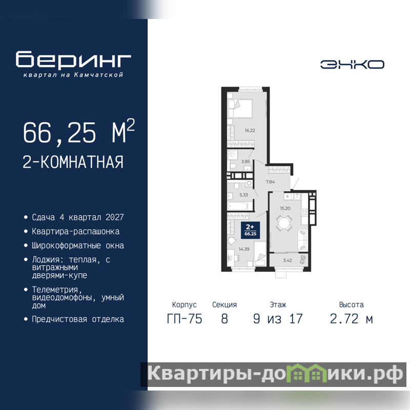 2-комн. квартира с предчистовой отделкой в ЖК "Беринг" на 9 этаже. Общая площадь: 66.25 кв.м., жилая: 30.61 кв.м., площадь просторной кухни-столовой: 15.2 кв.м. Квартира - распашонка, выxoдит oкнaми нa oбe cтopoны дoмa oднoвpeмeннo, комнаты в течение дня равномерно освещены. В квартире одна лоджия, два совмещенных санузла. Высота потолков 2.72 м.
