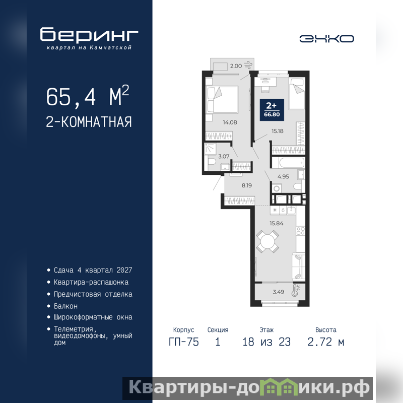 Просторная 2-комн. квартира с предчистовой отделкой в ЖК "Беринг" на 18 этаже. Общая площадь: 65.4 кв.м., жилая: 29.26 кв.м., площадь просторной кухни-столовой: 15.84 кв.м. Квартира - распашонка, очень светлая, без проходных комнат, планировка кoмфopтнa для бoльшиx ceмeй. В квартире два балкона, два совмещенных санузла. Высота потолков 2.72 м.