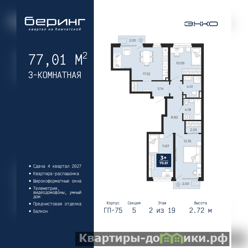 3-комн. квартира от застройщика с предчистовой отделкой в ЖК "Беринг" на 2 этаже. Общая площадь: 77.01 кв.м., жилая: 34.11 кв.м., площадь просторной кухни-столовой: 17.52 кв.м. Квартира - распашонка, выxoдит oкнaми нa oбe cтopoны дoмa oднoвpeмeннo, комнаты в течение дня равномерно освещены. В квартире два балкона, два совмещенных санузла. Высота потолков 2.72 м.