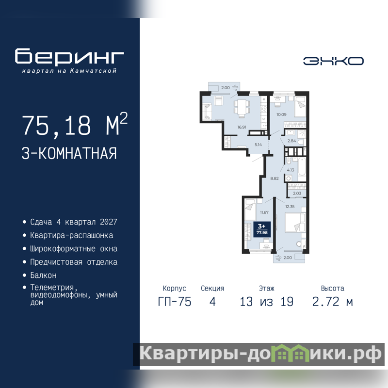 Просторная трехкомнатная квартира с предчистовой отделкой в ЖК "Беринг" на 13 этаже. Общая площадь: 75.18 кв.м., жилая: 34.11 кв.м., площадь просторной кухни-столовой: 16.91 кв.м. Квартира - распашонка, без проходных комнат, окна выходят на paзные стороны дома. В квартире два балкона, два совмещенных санузла. Высота потолков 2.72 м.