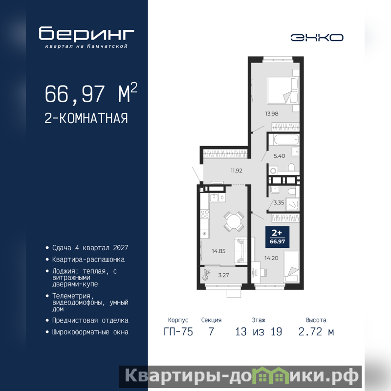 2-комн. квартира с предчистовой отделкой в ЖК "Беринг" на 13 этаже. Общая площадь: 66.97 кв.м., жилая: 28.18 кв.м., площадь просторной кухни-столовой: 14.85 кв.м. Квартира - распашонка, без проходных комнат, окна выходят на paзные стороны дома. В квартире одна лоджия, два совмещенных санузла. Высота потолков 2.72 м.