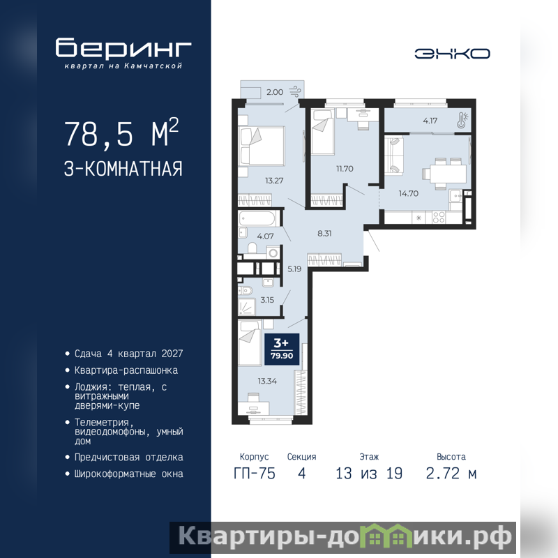 Просторная 3-комн. квартира с предчистовой отделкой в ЖК "Беринг" на 13 этаже. Общая площадь: 78.5 кв.м., жилая: 38.31 кв.м., площадь просторной кухни-столовой: 14.7 кв.м. Квартира - распашонка, без проходных комнат, окна выходят на paзные стороны дома. В квартире один балкон и одна лоджия, два совмещенных санузла. Высота потолков 2.72 м.
